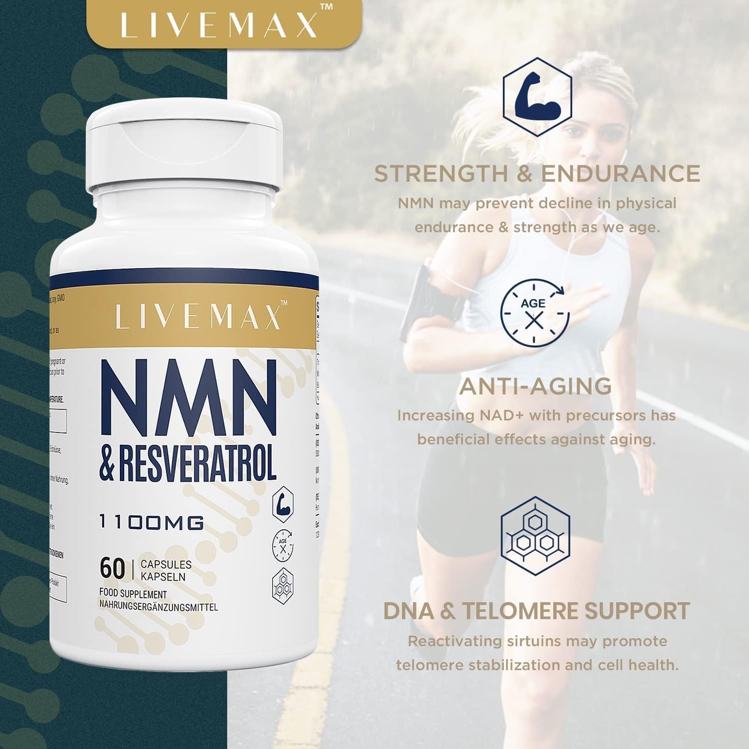 - مزيج متطور من مستخلص NMN وترانس ريسفيراترول والفلفل الأسود.
