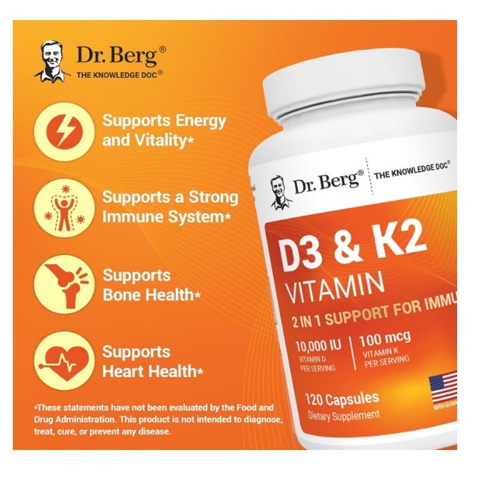 دكتور بيرج ماكس سترينث 7 في 1 فيتامين D3 K2 10000 وحدة دولية | مشتق طبيعياً D3 | تم اختباره والتحقق منه 4X | تركيبة عالية الامتصاص | مكمل فيتامين K2 D3 – 120 كبسولة