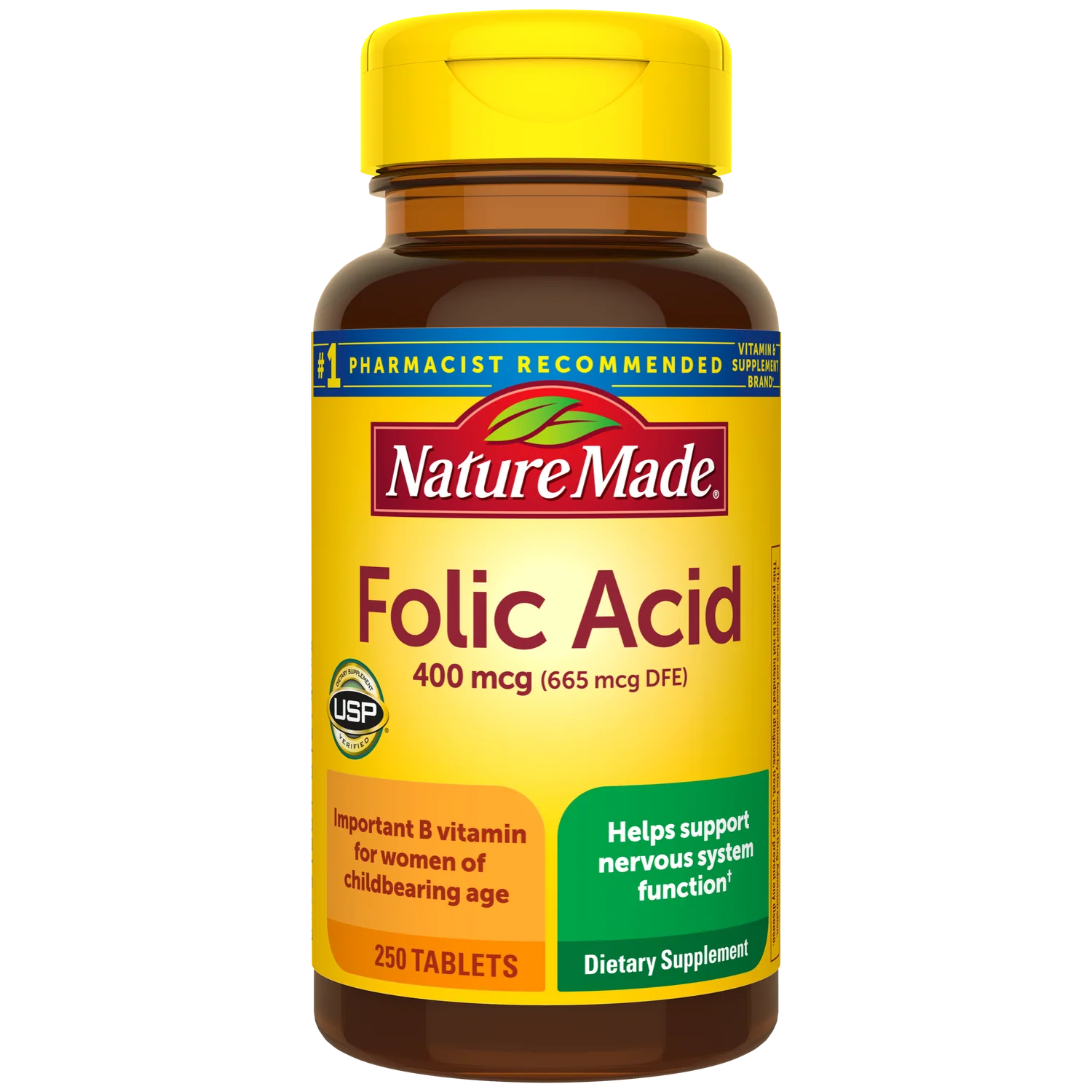 Folic acid, also known as folate and folacin from dietary sources, helps support the nervous system. It’s an important B vitamin for women of childbearing age, and it plays a critical role in the proper development of the baby’s nervous system. In fact, adequate folic acid in healthful diets may reduce a woman’s risk of having a child with a neural tube defect. Nature Made® Folic Acid Tablets provide 400 mcg of folic acid (Equivalent to 665 mcg DFE). It’s a little nutritional support for a whole lot of nervous system development.†