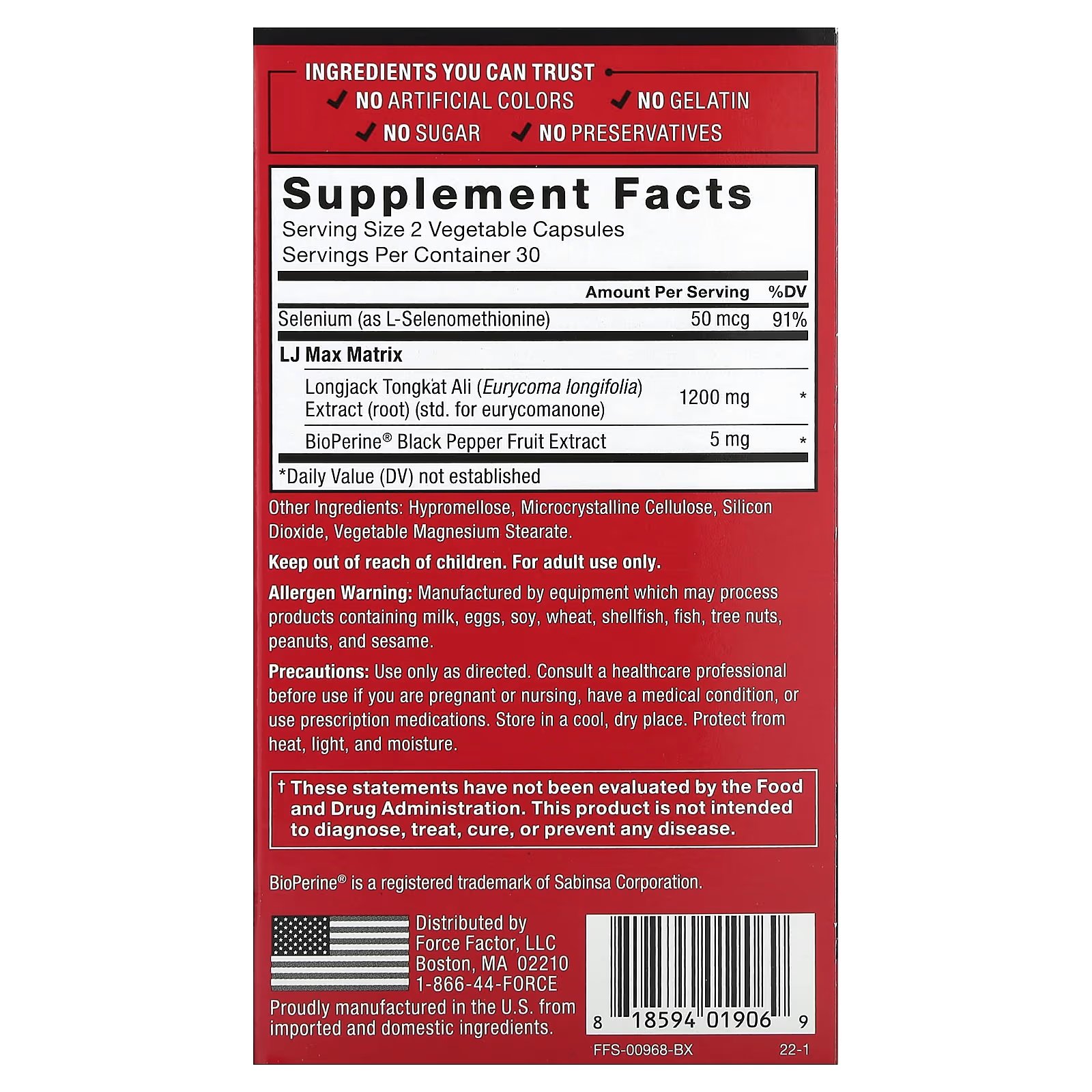 Force Factor® Longjack Tongkat Ali Max delivers a massive 1,200 mg dose of this ancient herb in the potent LJ Max Matrix. Every serving contains premium longjack tongkat ali extract, used by generations of men to ignite their vitality to maximize results in the bedroom and beyond.