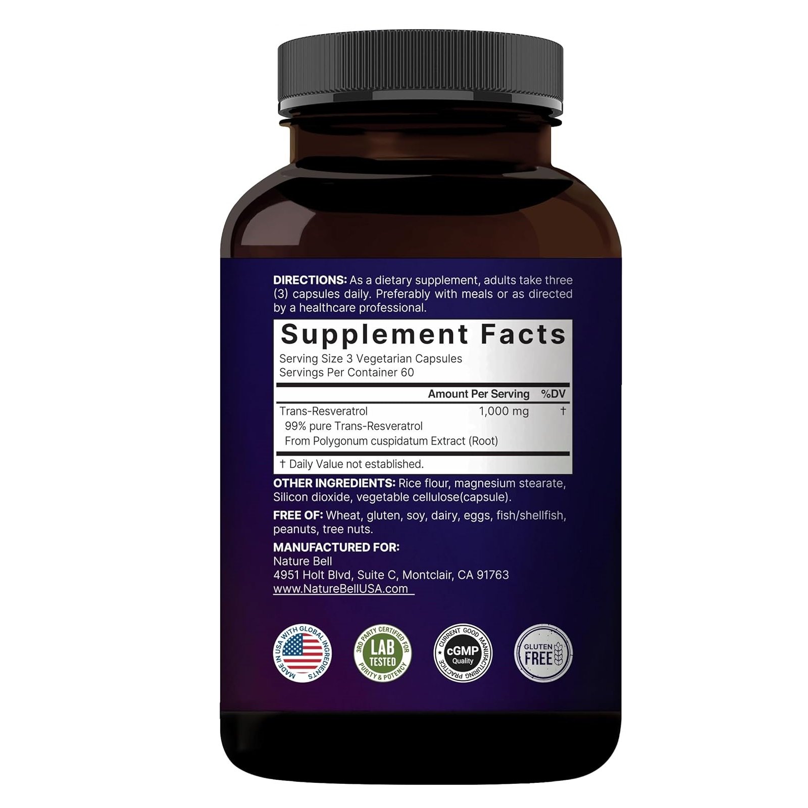 • { language_tag:en_US, Value:180 High Purity Veggie Capsules Per Jar, Serving Size of 3 Veggie Capsules, Delivers 1000mg Trans-Resveratrol Polygonum Cuspidatum Root Extract per dose, 60 total servings.