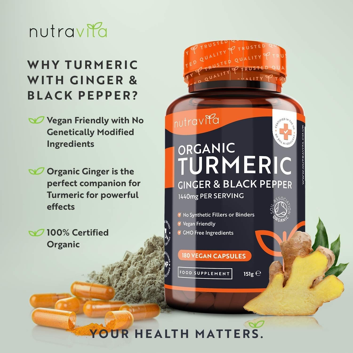 Nutravita Organic Turmeric Curcumin 1440Mg With Black Pepper & Ginger 180 Vegan Turmeric Capsules High Strength (3 Month Supply) Certified Organic By Soil Association Made In The Uk